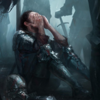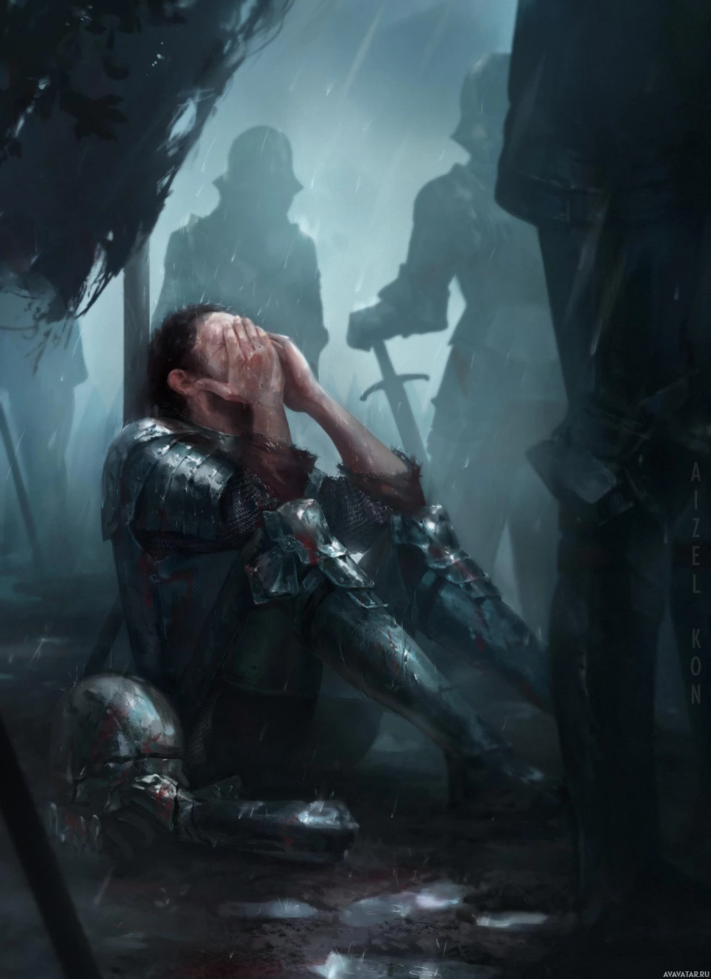 a dramatic scene of medieval soldiers on a battlefield. The central figure, who appears to be a warrior or knight, is sitting on the ground with his hands on his face as if he's crying or expressing