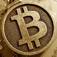 a Bitcoin symbol, which is the cryptocurrency known as Bitcoin. The Bitcoin sign is surrounded by electronic circuit boards and what appears to be