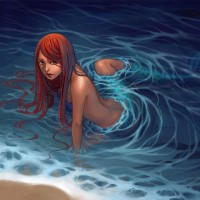 The image depicts a fantasy scene featuring a red-haired mermaid. She is sitting on the edge of an underwater body, her tail visible behind her as she emerges into the water. Her expression seems thoughtful or contemplative. The background suggests a serene and mystical underwater environment.