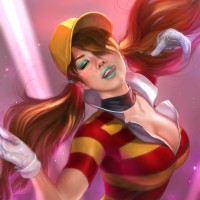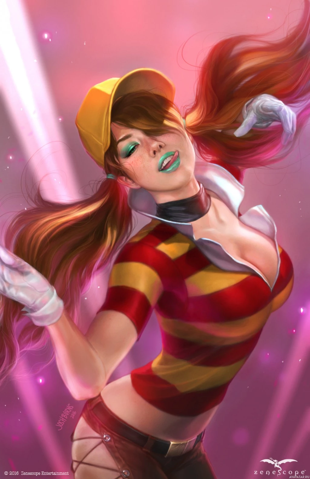red hair. She is depicted wearing an outfit that resembles the iconic character from
