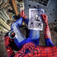 iconic suit with red and blue colors and the spider emblem on the chest. In his hand, he is holding what appears to be a poster or flyer for another character known as "The Spidey Killer". Spider-Man is sitting on a ledge that overlooks a city skyline, suggesting this scene takes place in a high-rise building in