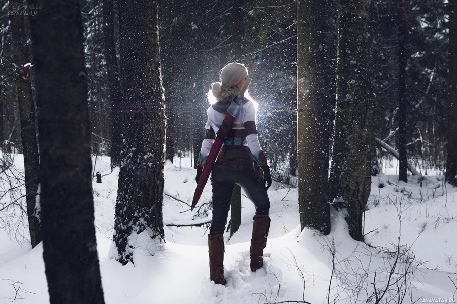 the video game "The Witcher 3: Wild Hunt." This character is named Ciri. She is standing in a snow-
