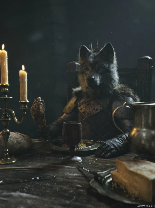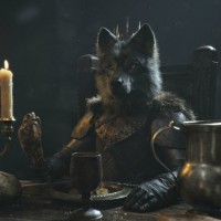 a fantasy scene featuring a werewolf in human form. This character is sitting at a table that appears to be set for a meal, with a crown on its head, indicating