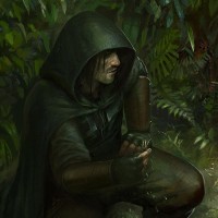 medieval setting. This individual is wearing robes and has a hood that's partially pulled over their head, which gives them an anonymous or mysterious appearance. They are crouching down next to what seems to be