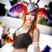 cosplay attire, portraying a character from a fantasy or gaming context. The individual has long