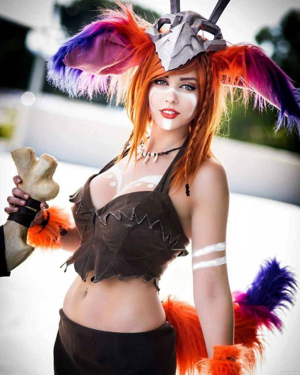 red hair and is wearing what appears to be an armor with a helmet adorned with animal ears, reminiscent of a warrior or fantasy character. They are also holding a staff-like weapon in one hand and seem to have some