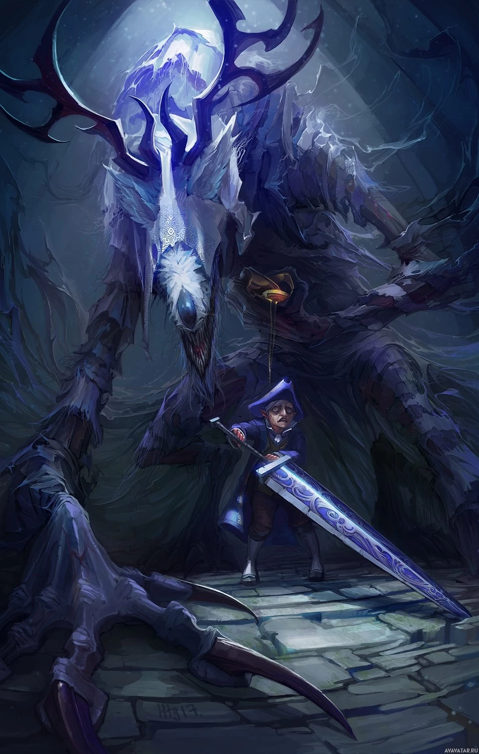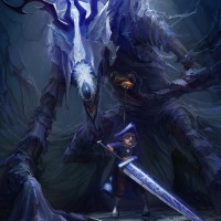 hind legs and holding what looks like an axe in its right paw. The setting seems to be a dark, damp environment with
