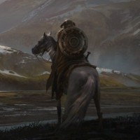 a dramatic sky with clouds and possibly the beginning of a storm. The landscape appears to be part of the fictional world within the "