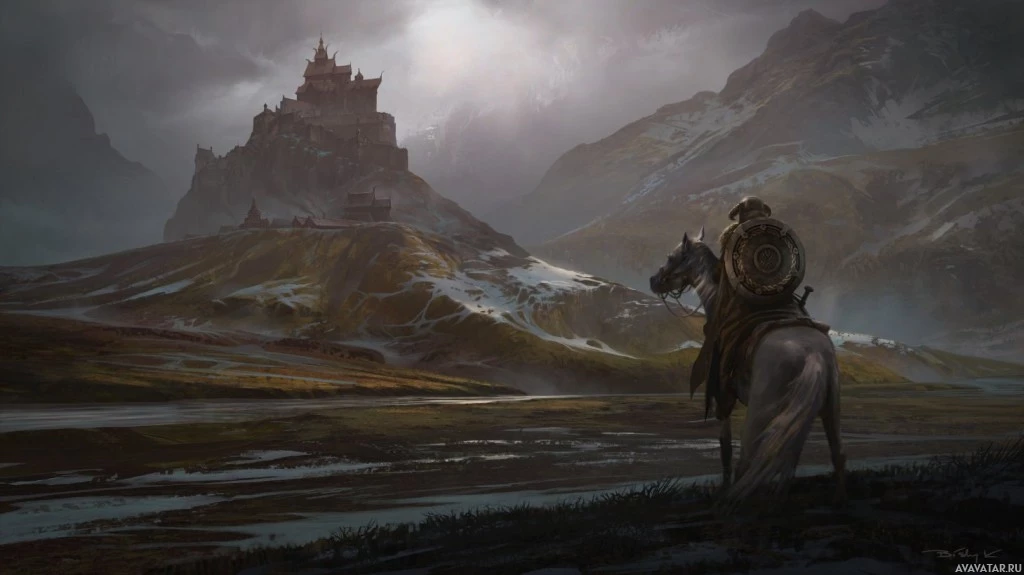 playing game (RPG) settings. There is a character riding on horseback in the foreground with a castle or fortress perched atop a hill or cliff in the background under