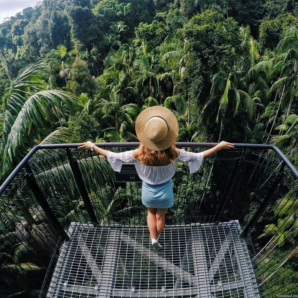 a white top and has her hands resting against a metal railing, which is part of the bridge structure. She appears to be looking out at the view below, possibly enjoying the natural surroundings or appreciating the height above