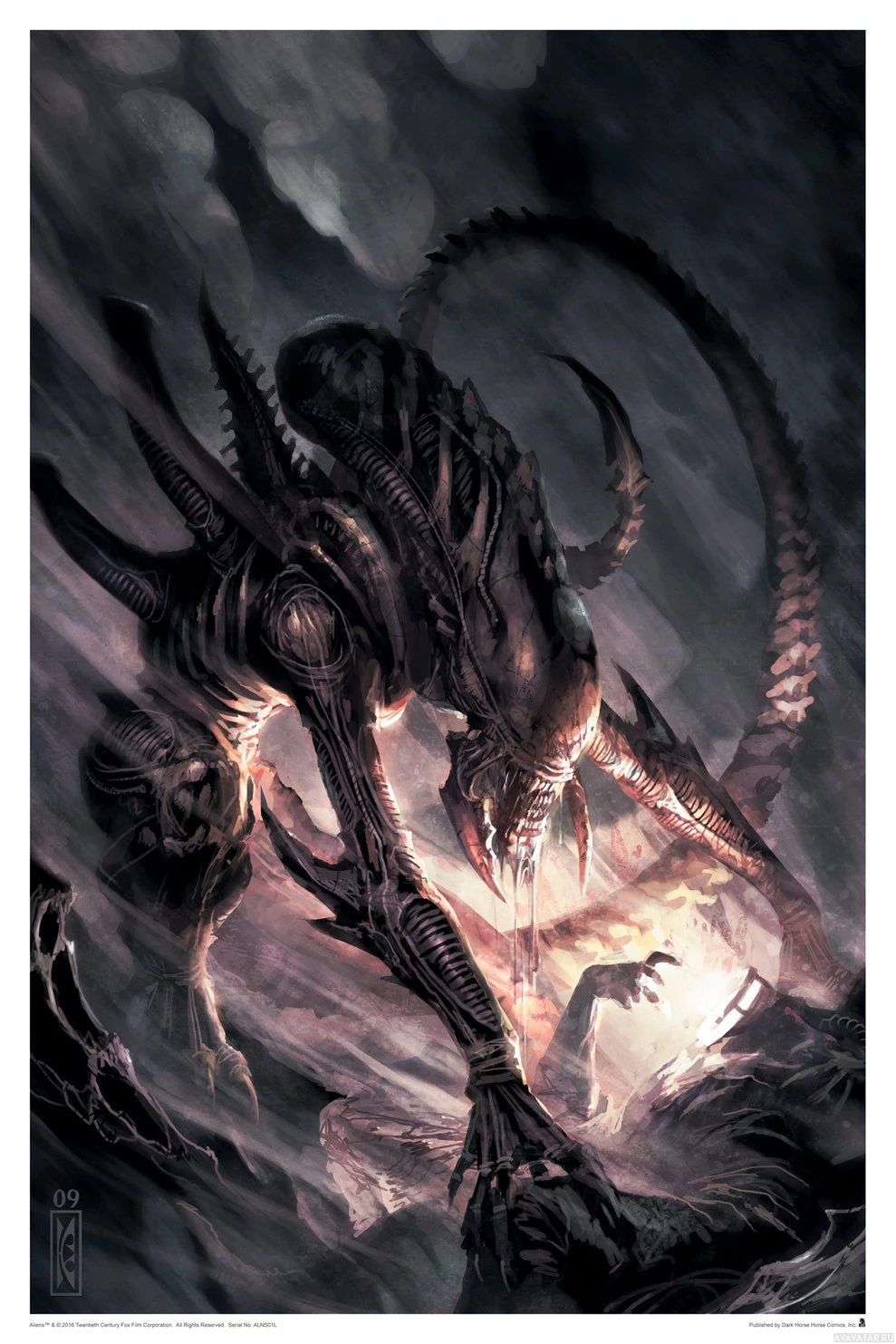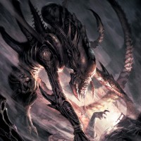 an alien creature that appears menacing and aggressive. It has