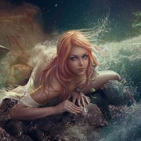 red hair and her tail is visible behind her, blending into the underwater environment. Her expression is calm, and she appears to be gazing towards something out of frame. The setting suggests a magical or fantasy theme, as mermaids are