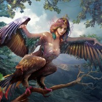 mythical creatures with the body of a bird and the head and often torso of a human, which in this representation is shown as an adult female with wings spread wide. She has detailed feathering on her wings and tail, indicating she may have some sort of magical or mystical nature. The character is surrounded by natural scenery that suggests a forest or