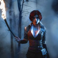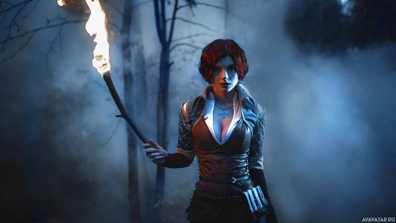 the video game "The Witcher 3: Wild Hunt," specifically Triss Merigold, portrayed by actress Anna-Maria Sieklucka. She is holding a torch with both hands in front of her. The character is wearing an outfit that reflects her role as a sorceress within the game's universe. The setting appears to be a misty,