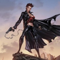 a female character from the DC Comics universe. She is dressed in black, with a noticeable red accent on her
