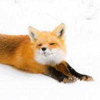 a relaxed posture against the backdrop of a white, snow-covered landscape.