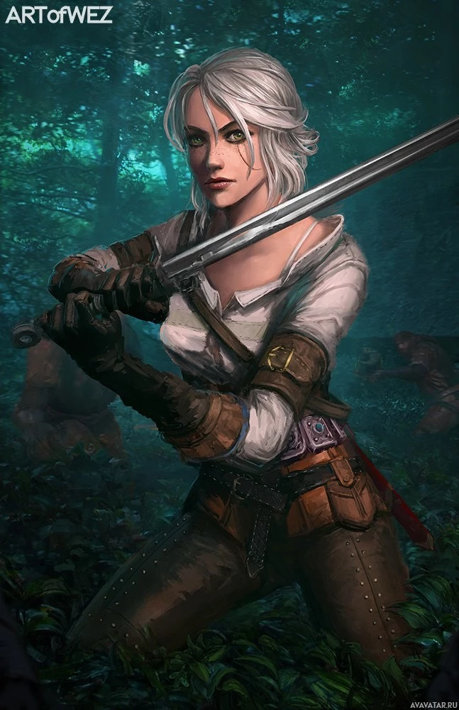 the video game "The Witcher 3: Wild Hunt." This character is known as Ciri, who is portrayed holding a sword and wearing armor. She has