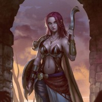 The image depicts a female character that appears to be from a fantasy setting. She has purple hair and is wearing armor and holding a spear, suggesting she may be a warrior or fighter. The background shows a landscape with ruins, which could indicate an ancient or mythical location. The artwork conveys the impression of being in a scene from a fantasy story or game.