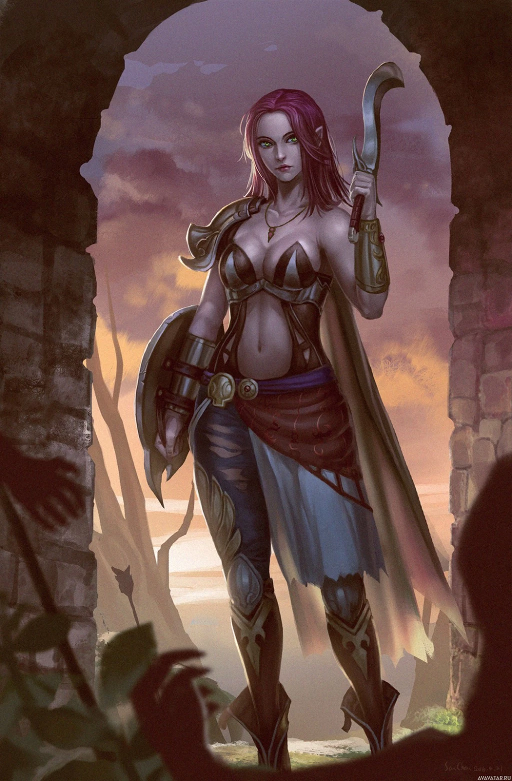 Картинка показывает женского персонажа, который, кажется, из фантастической обстановки. У нее фиолетовые волосы, она носит доспехи и держит копье, предполагая, что она может быть воином или бойцом. На заднем плане изображен пейзаж с руинами, которые могут указывать на древнее или мифическое местоположение. Произведение искусства передает впечатление пребывания в сцене из фантастической истории или игры.