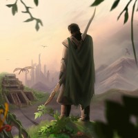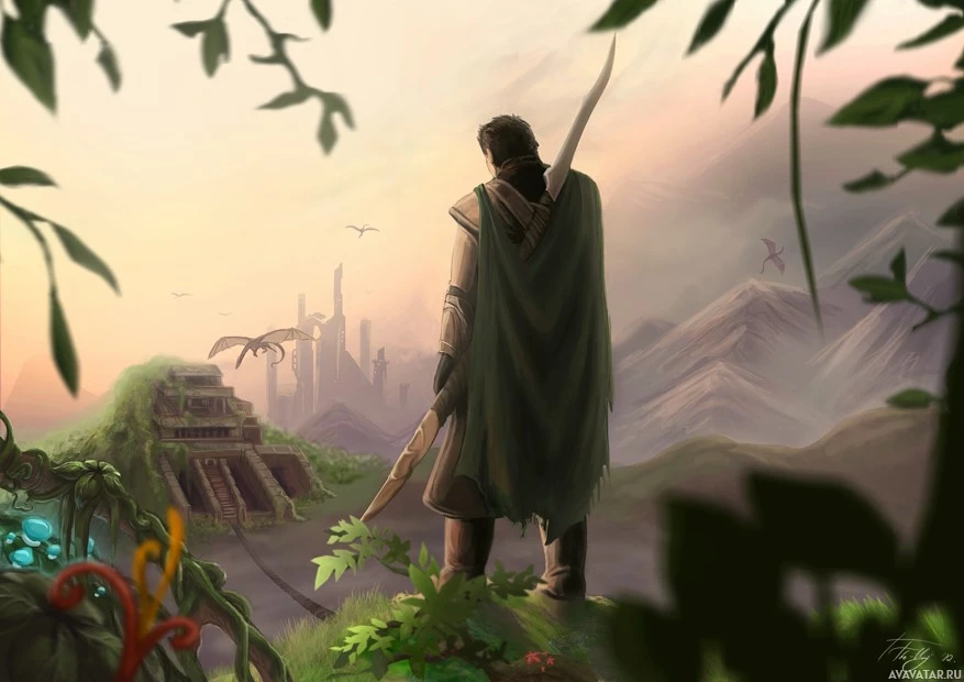 a fantasy setting: mountains, vegetation, and what might be ruins or an ancient structure in the background. The lighting suggests it could be either dawn or dusk due to the soft,