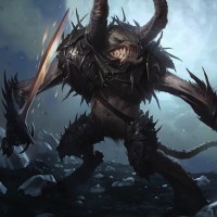 a fantasy scene. There is a creature that appears to be a mix between a humanoid and a monster, possibly inspired by