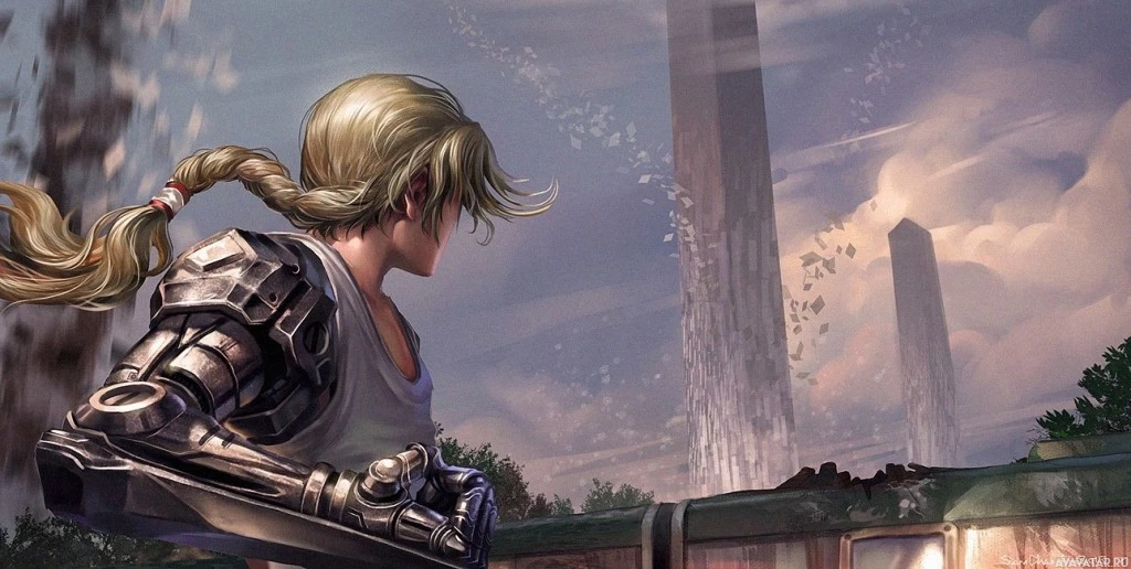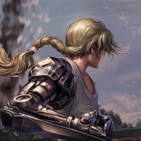 female character with blonde hair, who appears to be a warrior or fighter. She is wearing armor and holding what looks like a sword in her left hand, suggesting she is prepared for combat. Behind her is