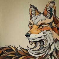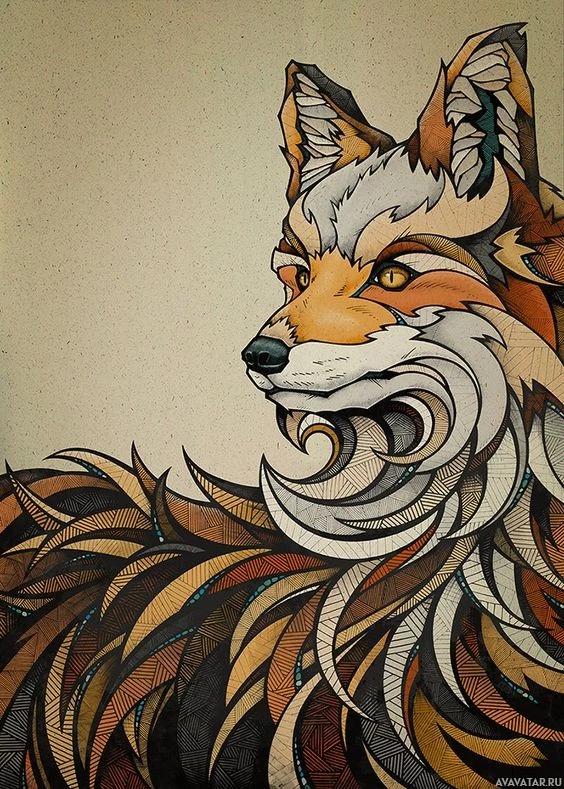 intricate patterns and designs on its body, which are characteristic of artistic representations of animals. The fox is depicted with prominent facial features such as