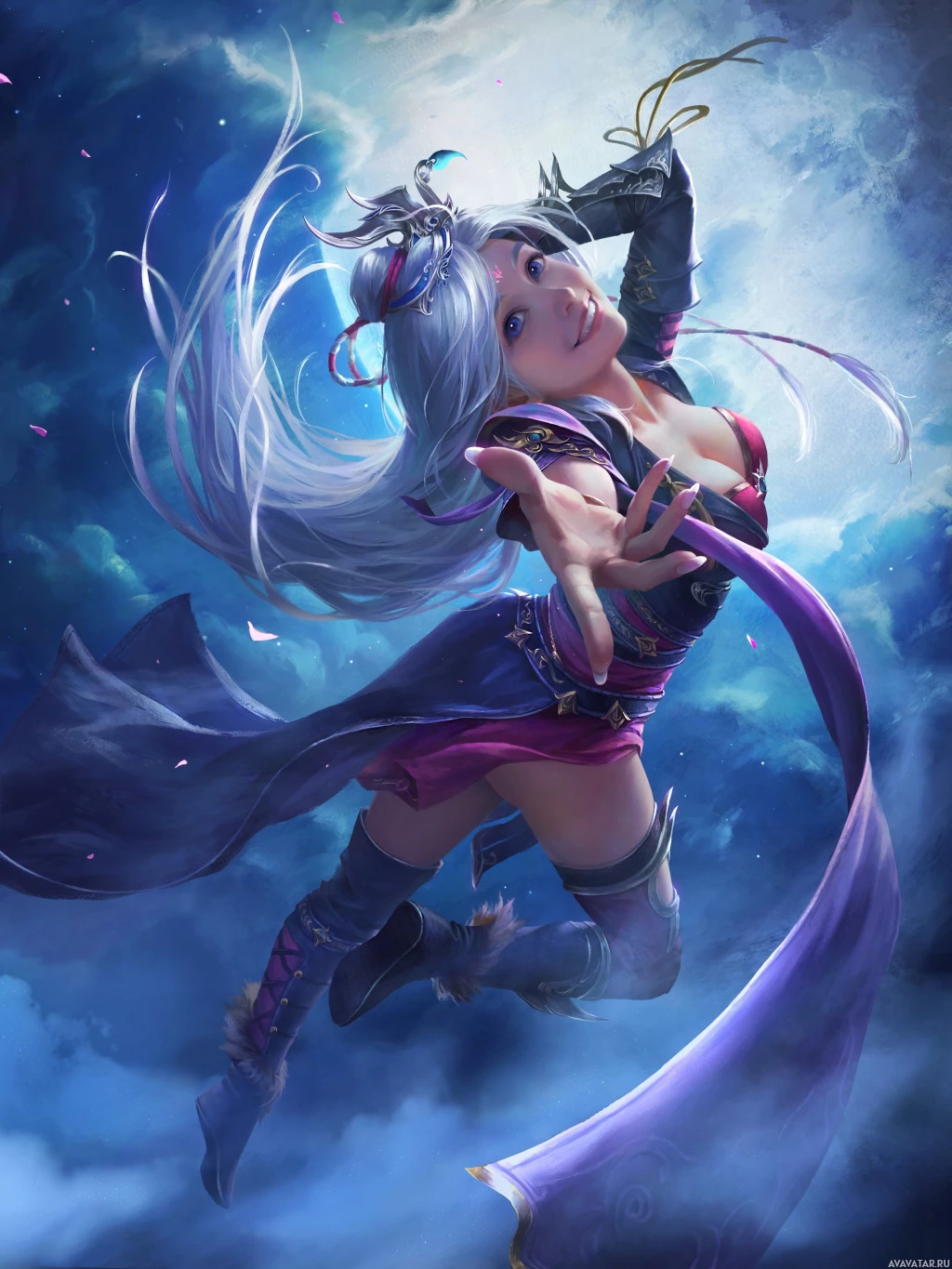 a cheerful expression and is looking towards the viewer. She's wearing what appears to be fantasy-style clothing, possibly inspired by Eastern or Asian attire. Her right hand seems to be holding