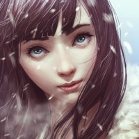 blue eyes and is depicted looking to the side with a gentle expression on her face. There are snowflakes gently falling around her, suggesting