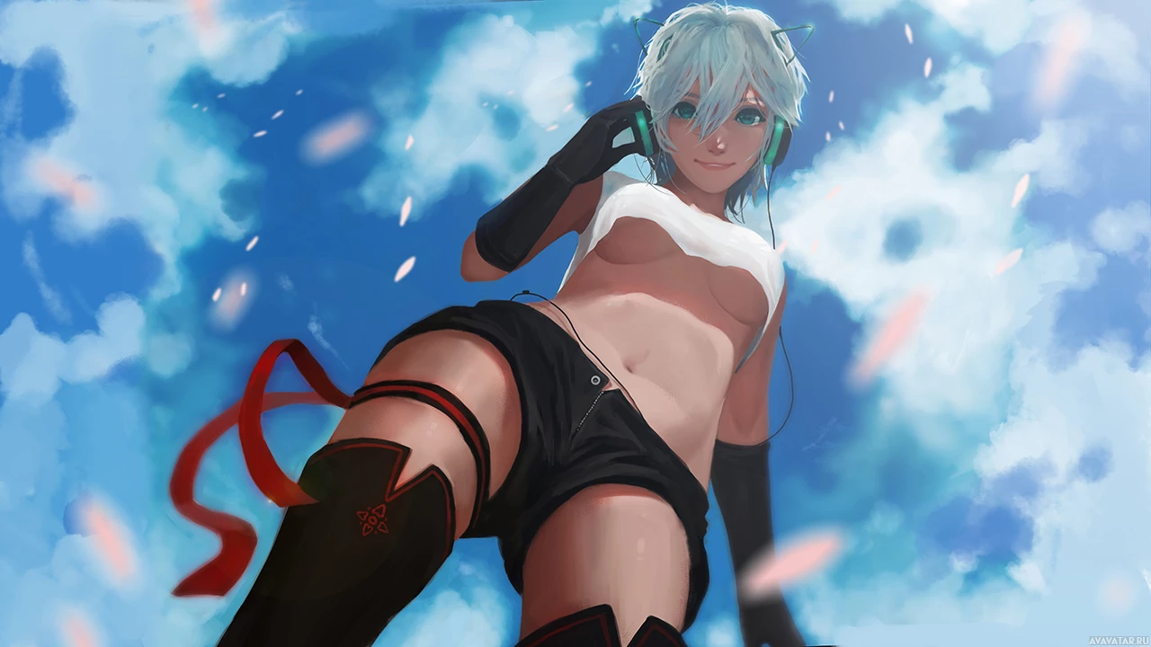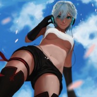 white hair and wears black clothing with thigh-high boots. There's a scarf wrapped around her waist. She is standing against a backdrop that includes