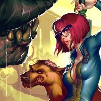 the Fallout series, where characters are often armed. There is also a large creature looming over her; this could be a creature from