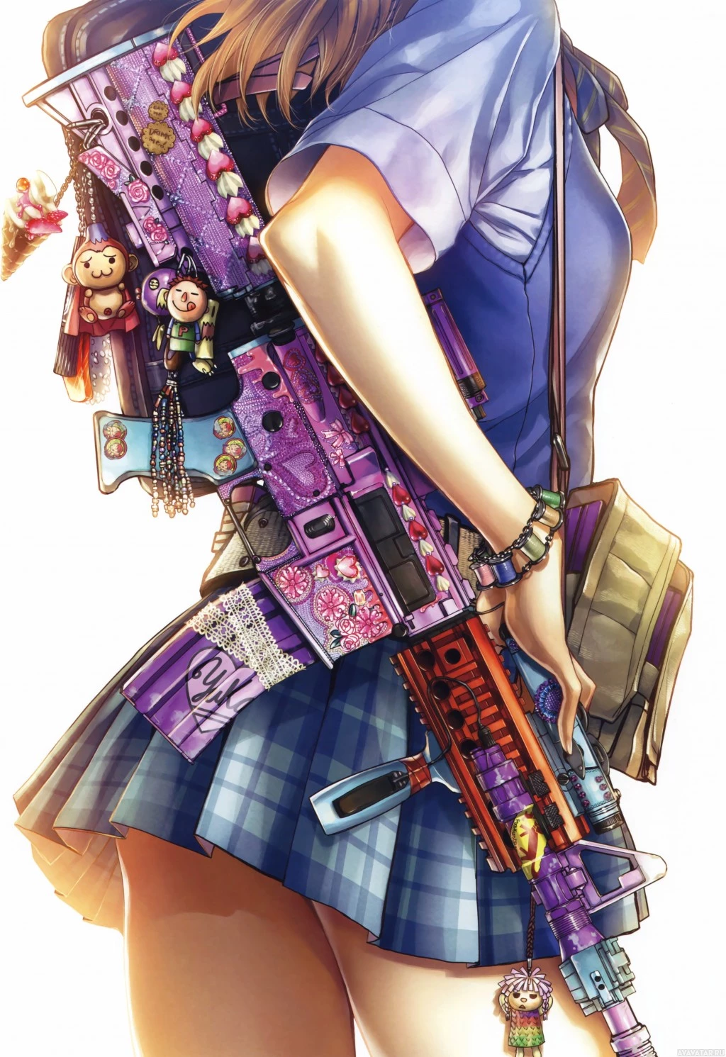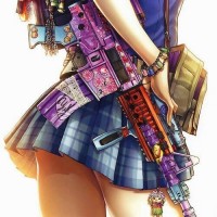 a school uniform with a plaid skirt and blue top, and there are various items strapped or attached to her body. These include what seem to be weapons, possibly in the form of