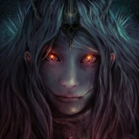 glowing eyes that give off a red hue, which could symbolize power or danger. There is a crown-like structure on their head, suggesting they may be of royal status or possess