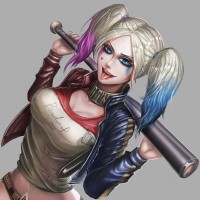 Harley Quinn, a fictional character from the comic books published by DC Comics. She is depicted wearing her signature outfit which includes a black and red jacket with the Joker's face on it, purple and blue pigtails, and holding