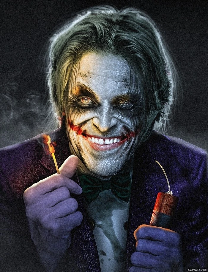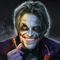 particular rendition of the Joker, he appears to be smiling or grinning and holding a match between his fingers, which could imply an intent to create chaos or mischief in a typical Joker fashion. The image is designed to evoke a sense of danger and anarchy often associated with the character's portrayal in various media, such as movies and