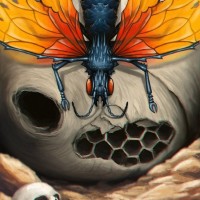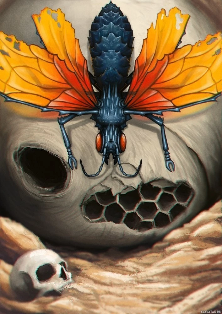The image depicts a fantasy or science fiction-themed illustration. It features an insect-like creature, which appears to be a stylized version of a mantis or locust, characterized by its