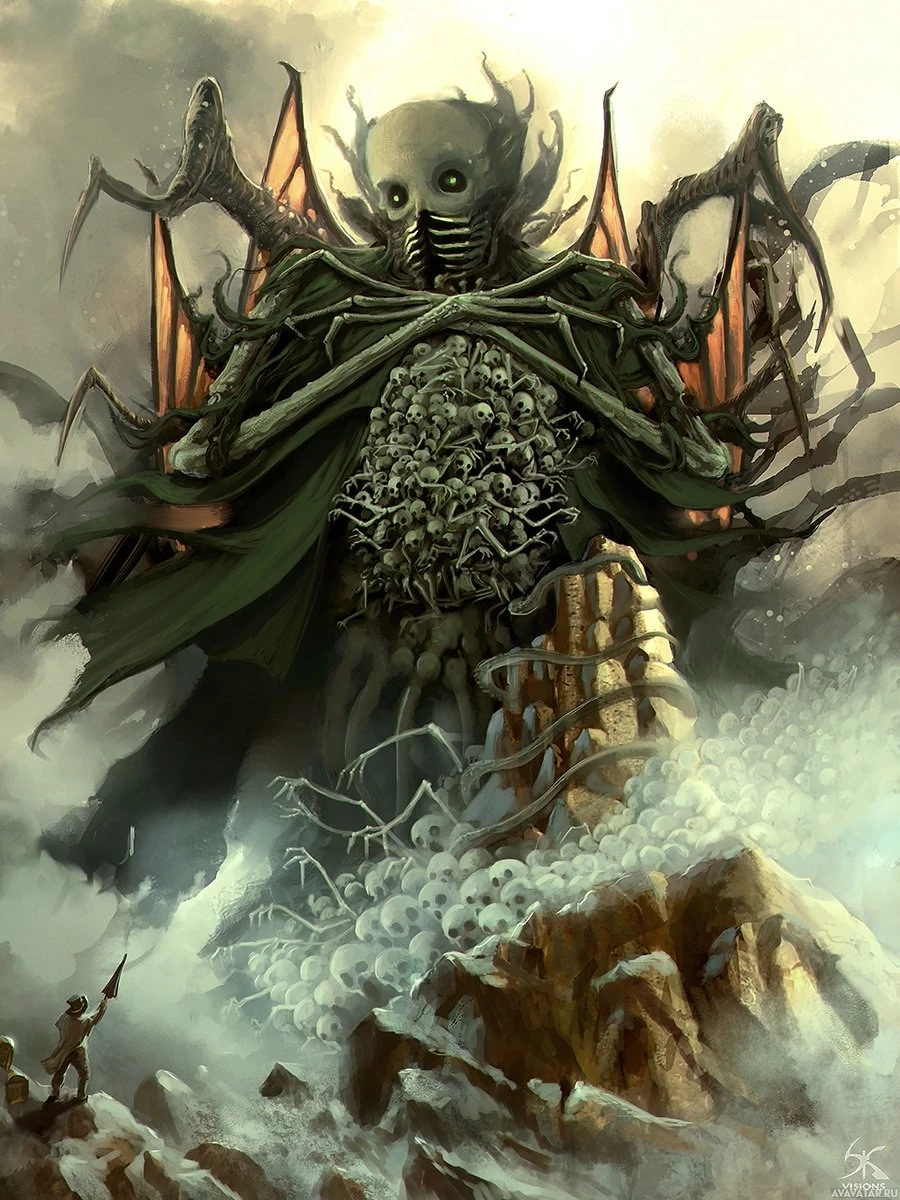 a humanoid figure, but its head appears to be a skull with large, ominous eyes. The creature's body is covered in what seems to be various pieces of armor or bone-like structures. It also features multiple arms with