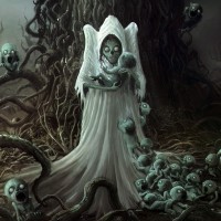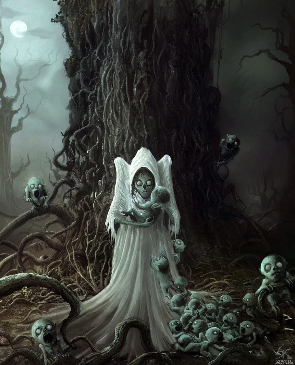 dark hair and is dressed in a long white robe. Surrounding them are numerous small figures resembling babies or fetuses, all appearing pale and ghastly, as if they are also undead or