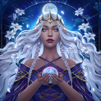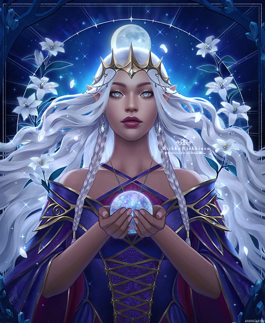 white hair and is adorned with various fantasy elements such as ornate clothing, jewelry, and a tiara on the head. She appears to be gazing into a gem or