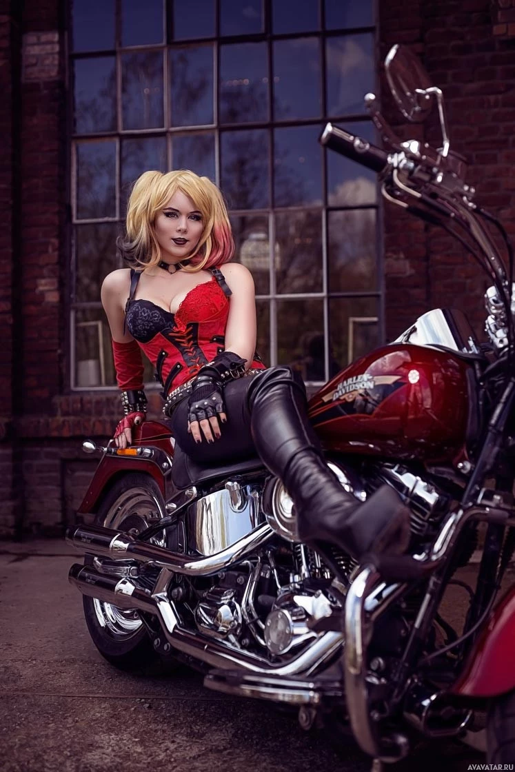 Harley Quinn, a fictional character from comic books and media adaptations. This individual is seated on a motorcycle, wearing a black and red outfit with elements that resemble
