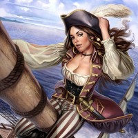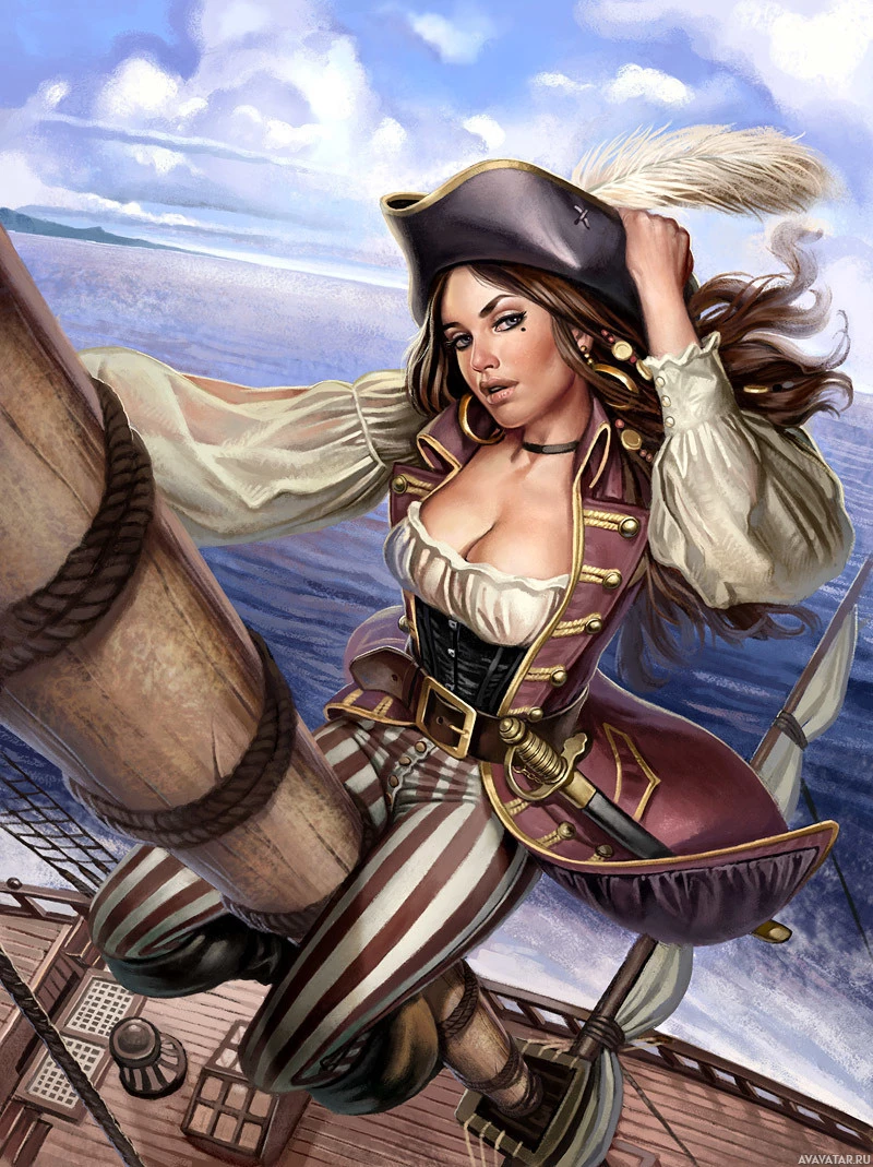 a female pirate, sitting on the edge of a ship and holding onto a railing. She is wearing traditional