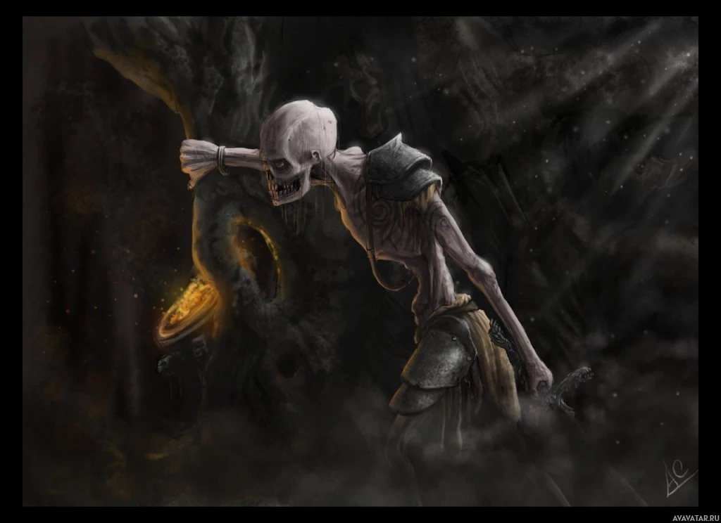 an undead creature that resembles a skeleton. It appears to be depicted as a warrior or guardian, given the armor and weaponry it is equipped with. The setting suggests a dark or underground environment, possibly a dungeon or crypt. The artwork has a dramatic and moody atmosphere, fitting the typical themes associated with