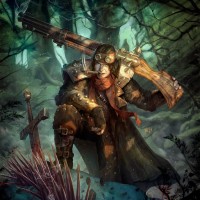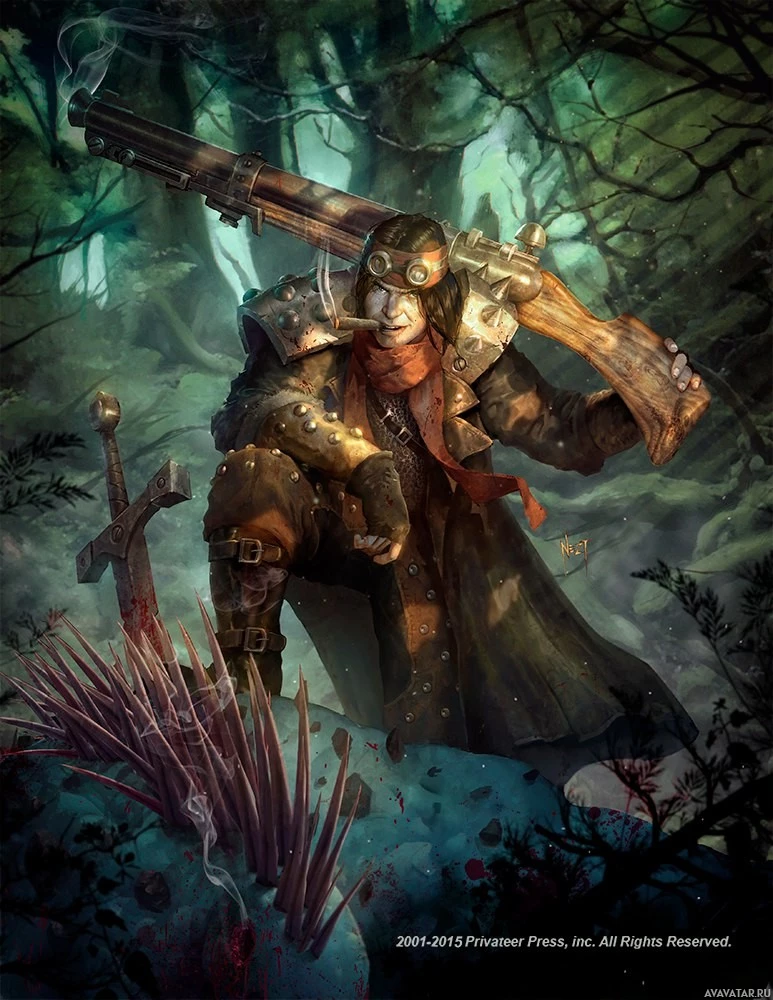 a fantasy character who appears to be a warrior or adventurer. The character is holding a weapon, which looks like a rifle or musket, and they are dressed in armor with what seems to be a helmet that has