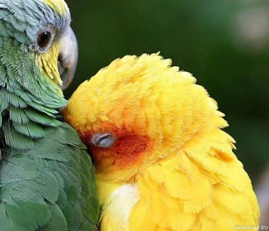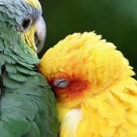 yellow feathers. The bird on the right appears to be asleep or resting its head on the other bird's body, which is a common behavior among many