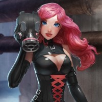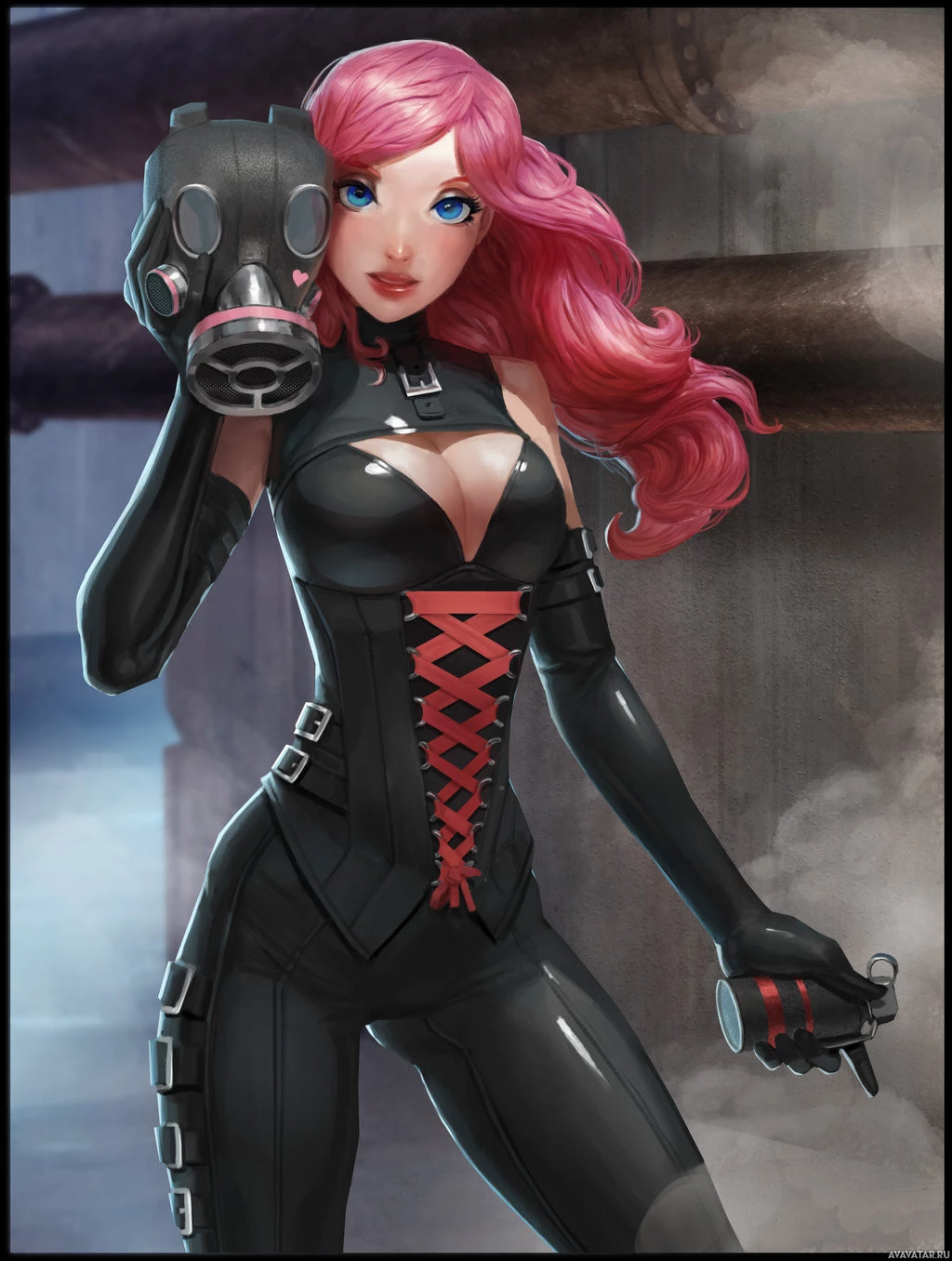 На картинке изображен стилизованный, анимированный персонаж, который выглядит как женщина с розовыми волосами и в черной кожаной броне, которая включает противогаз. Персонаж также держит в руке то, что выглядит как оружие или инструмент.