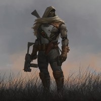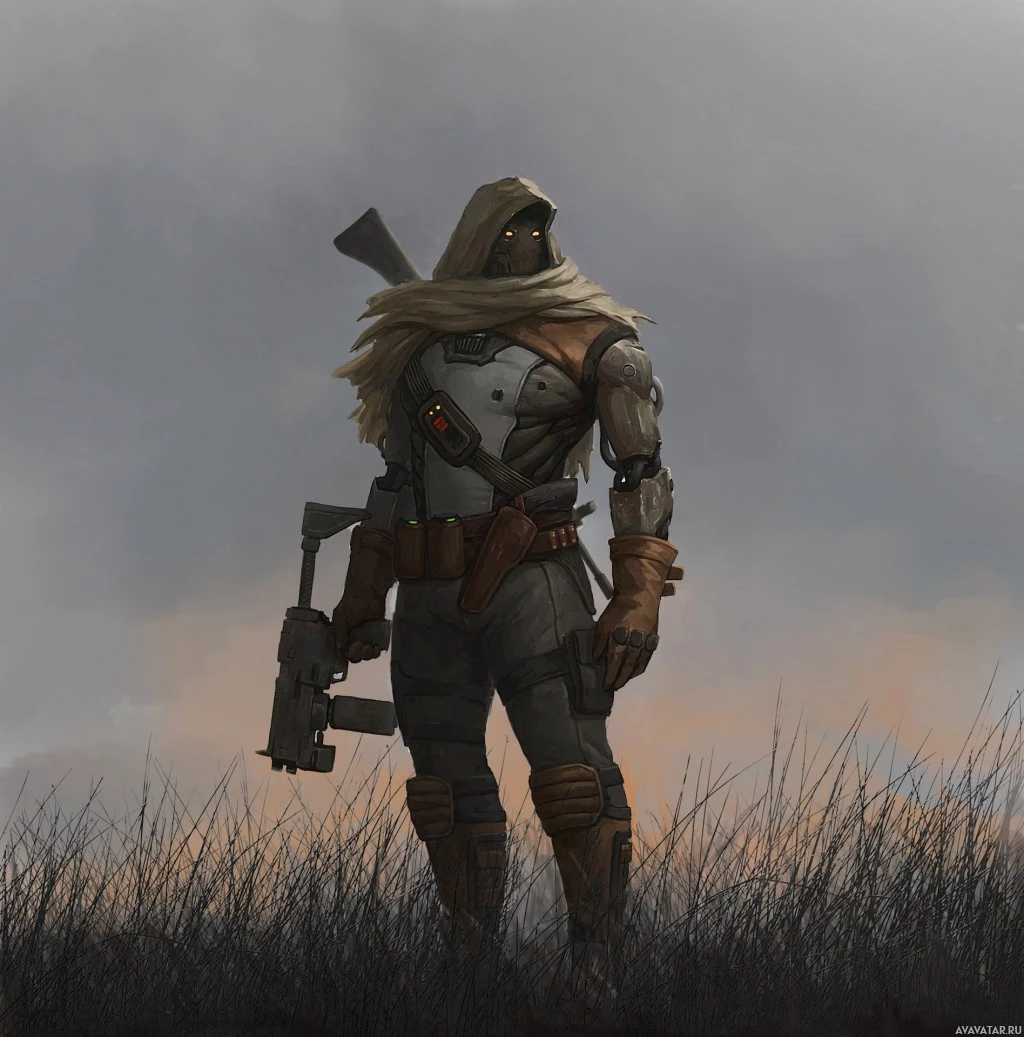 a video game or comic book. This character is wearing what seems to be a futuristic or dystopian outfit, including a hood that obscures the face and a cloak. The character is equipped with