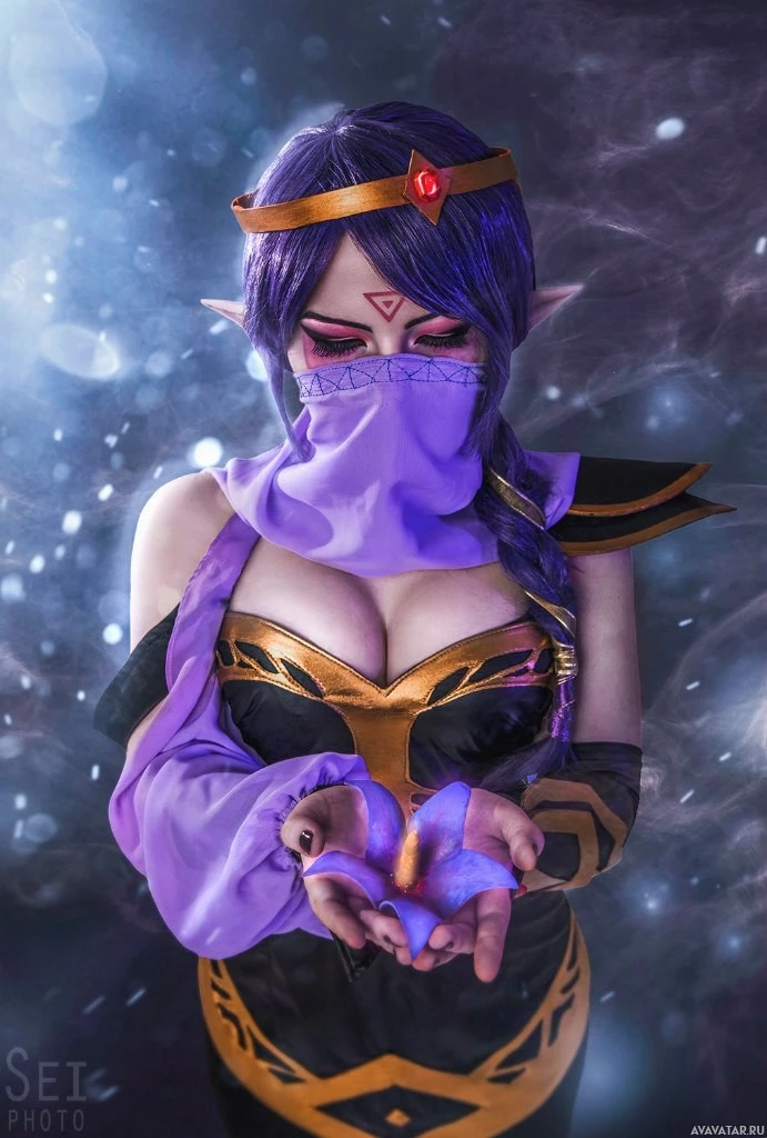 the video game Dota 2, who is cosplayed as Templar Assassin. She is wearing an armor and holding a staff with one hand while her other hand is touching