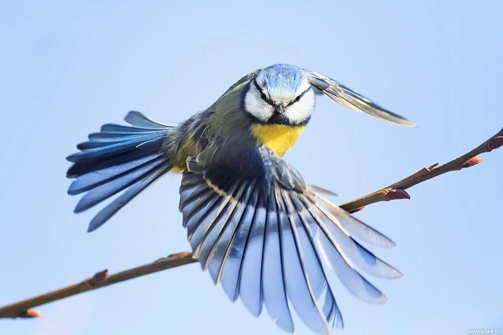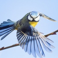 small bird is perched on a branch and is shown spreading its wings wide open, as if it's in the middle of taking flight or possibly displaying its full wing span. The background appears to be clear with no other objects visible, putting the focus entirely on the bird itself.