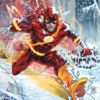 an urban setting that looks like it could be during winter due to the snow on the ground and the icy appearance of some surfaces. The Flash is shown with his iconic lightning