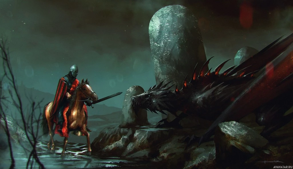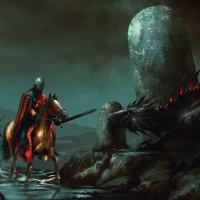 a fantasy scene with a rider on horseback. The rider is wearing armor and has a sword, suggesting they might be a warrior or a knight. In the background, there appears to be a dragon or a creature that resembles one, adding an element of